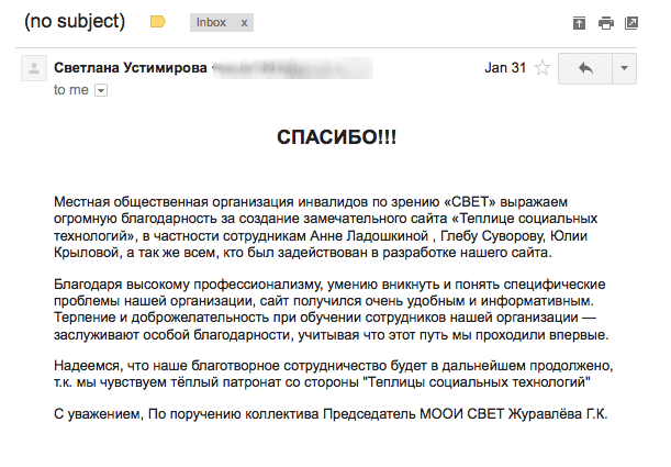 Мы тронуты благодарностью, которую получили от наших победителей и в частности от Галины Кузьминичны Журавлевой, основателя МРООИ «СВЕТ», которая руководит ею бессменно в течение 20 лет.