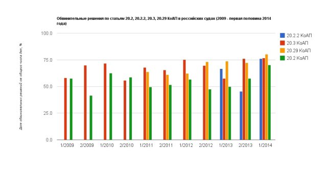 - На первое полугодие 2014 года пришелся максимум обвинительных постановлений практически по всем рассматриваемым статьям: 70% от всех рассмотренных дел по статье 20.2 КоАП, 76% по статье 20.2.2, 77% по статье 20.3, 80% — по 20.29