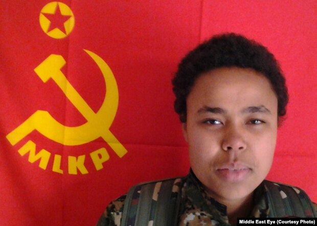 Официальный представитель курдской партии в Европе передал журналистам фотографию женщины в форме, стоящей на фоне красного и желтого флага базирующейся в Турции Марксистско-ленинской коммунистической партии.