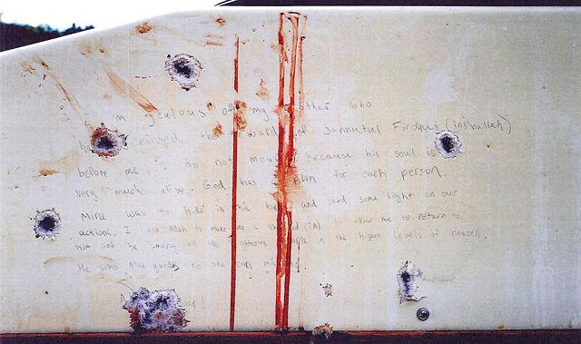 Отдельные слова в послании разобрать невозможно из-за пулевых отверстий. На борту лодки также видны следы крови.
