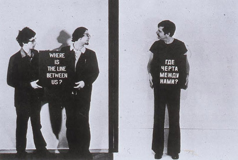 На этих фотографиях художники, стоя по разные стороны от вертикальной черты, держат таблички с парадоксальными вопросами о смысле и назначении разделяющего их барьера, который они в конце концов преодолевают.