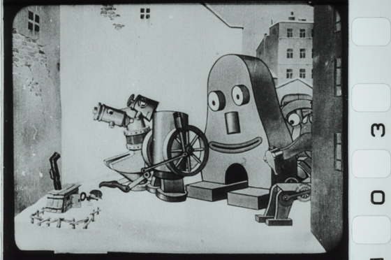 Вот советская анимация 20-х. «Винтик-шпинтик» Владислава Твардовского (1927 год). Под бодрые стихи Агнивцева перед нами разворачивается пугающее, невиданное зрелище. Оборотная сторона модернизма: по Ленинграду идут ожившие станки. Несмотря на веселую музыку, их шествие ужасает. Каждый станок больше напоминает ночной кошмар, монстра с картины Босха или Грюневальда. Но в то же время в поведении механизмов есть что-то глубоко человеческое, что-то, чего нет, например, у героев мультфильма «Гляди в оба», созданного Даниилом Черкесом в 1934 году. Здесь колхозный тунеядец превращен в абстракцию, конструкцию из кривых с головой и гармошкой, а кулак (которого в финале уведет куда-то вдаль пионер, вооруженный огромным мечом) обращается в двуликое, лишенное человеческих качеств существо.