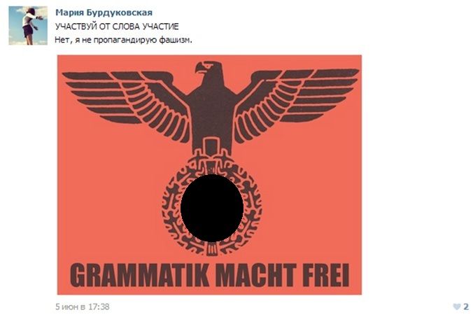 5 июня 2014 года на своей странице «ВКонтакте» Бурдуковская разместила картинку с немецким орлом и подписью Grammatik Macht Frei. Она уточнила, что не пропагандирует фашизм.