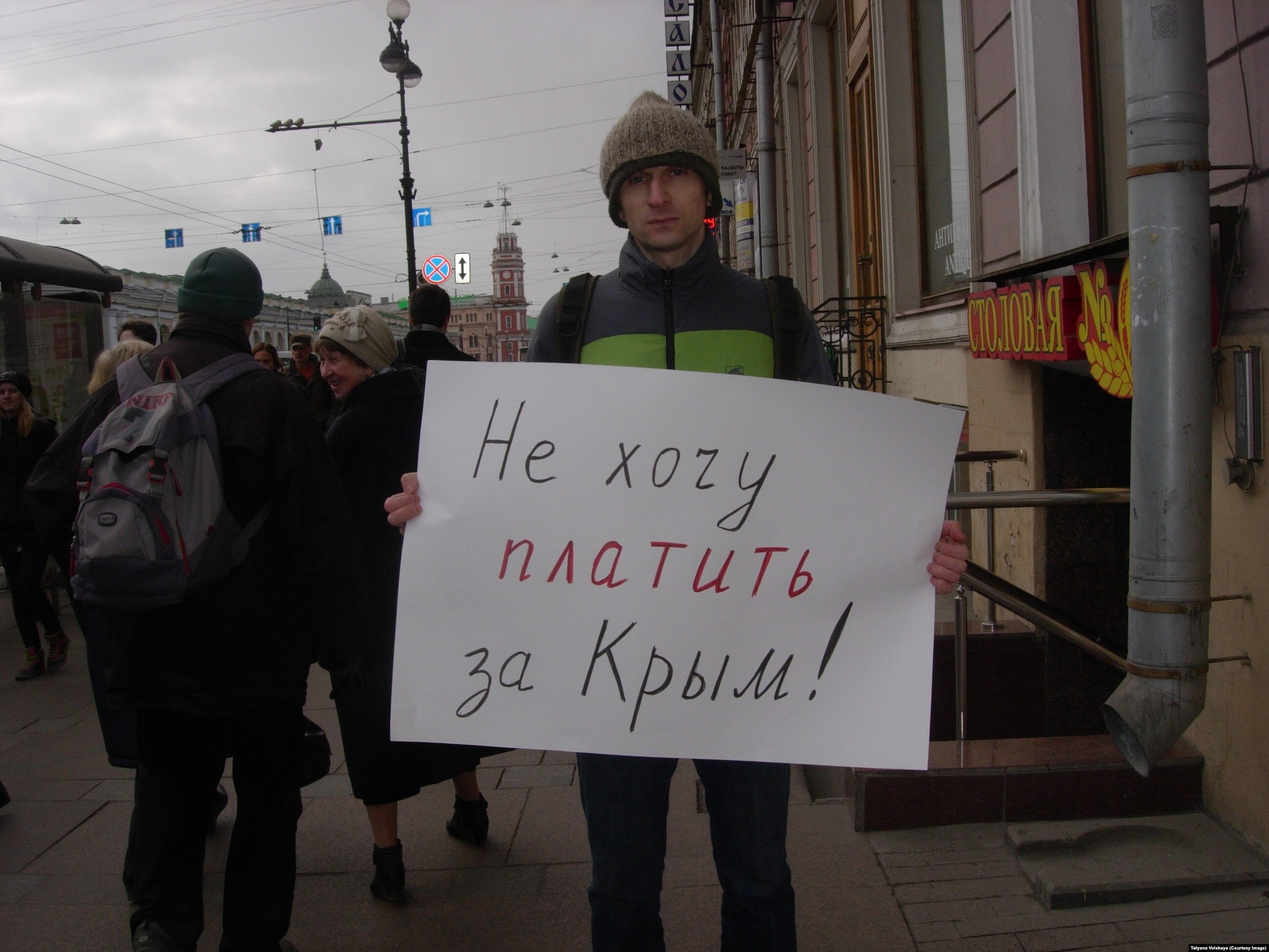 Как сообщает корреспондент Радио Свобода Татьяна Вольтская, участники акции выступили против аннексии Крыма и последовавших увеличения расходов на вооружение, уменьшения зарплат, сокращения расходов на медицину, образование и другие социальные нужды. Среди плакатов был один, посвященный крымским татарам, его держал организатор акции Всеволод Нелаев.
