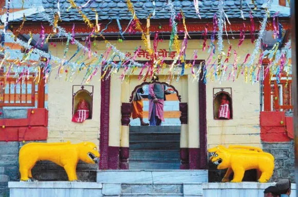 Изящный храм Бхимакали из камня и дерева (для устойчивости в случае землетрясения) построен в виде трехэтажной пагоды, сочетающей индуистский и буддийский стили. Тонкая резьба по дереву и серебряные украшения дверей привлекают внимание. Четыре раза в день проводятся службы (аарти). Рано утром, еще затемно, меня разбудила громкая музыка и голоса, раздававшиеся из храма. Днем захотелось попасть внутрь интригующей тайны. Главный вход в храм охранял старик с еще более древним ружьем. У других дверей стояли игрушечного вида желтые тигры и львы из гипса.