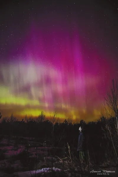 Вечером 17 марта, выйдя в 90 км к югу от Москвы из дома, я удивился странным облакам, подсвеченным зеленым светом. Через минуту стало ясно, что это совсем не облака — по всей северной стороне неба почти до зенита раскинулось яркое полярное сияние (я хорошо знаю, как оно выглядит, неоднократно наблюдал его от 60° до 70° с. ш.). Малиновые столбы, переходящие в фиолетовые, — к западу; к северу — зеленый занавес, чуть к востоку — малиновое пятно, почти до самого зенита протянулись две голубоватые полосы, между ними — «W» Кассиопеи.