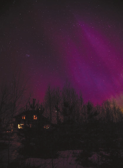 Это значит, что красные (малиновые) столбы, которые я видел под Пущиным, те, что сфотографировала Ирина Якутенко под Истрой, и те, что снял Алексей Кириллов и его жена Нина Ширяева в Калужской области (см. фото), — одно и то же. Наиболее яркое зеленое свечение азота излучается ниже — от 90–100 км, где-то на этом уровне находится нижняя граница полярного сияния, обычно довольно резкая. Именно от сотни километров вверх идут зеленые извивающиеся занавесы — самый узнаваемый тип сияния.