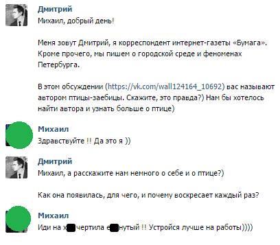 Автор материала на «Бумаге» попытался связаться с предполагаемым автором птицы-за*бицы, но получил только жизненный совет.