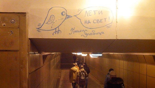 В подземном переходе из метро «Купчино» в Санкт-Петебурге уже несколько лет появляется рисунок птицы с различными высказываниями. Персонаж по имени птица-за*бица возрождается вновь и вновь, несмотря на попытки закрасить его.