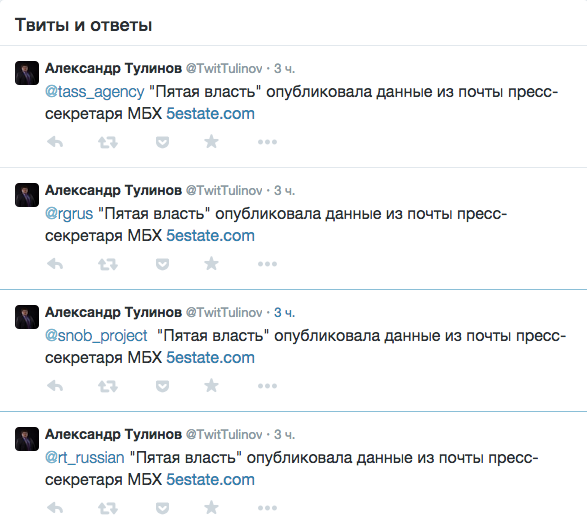 В твиттере ссылку на сайт с перепиской распространяли боты. Они отправляли сообщения с упоминанием отдельных СМИ, в том числе ТАССа, «Коммерсанта», «Сноба», «Российской газеты» и других.