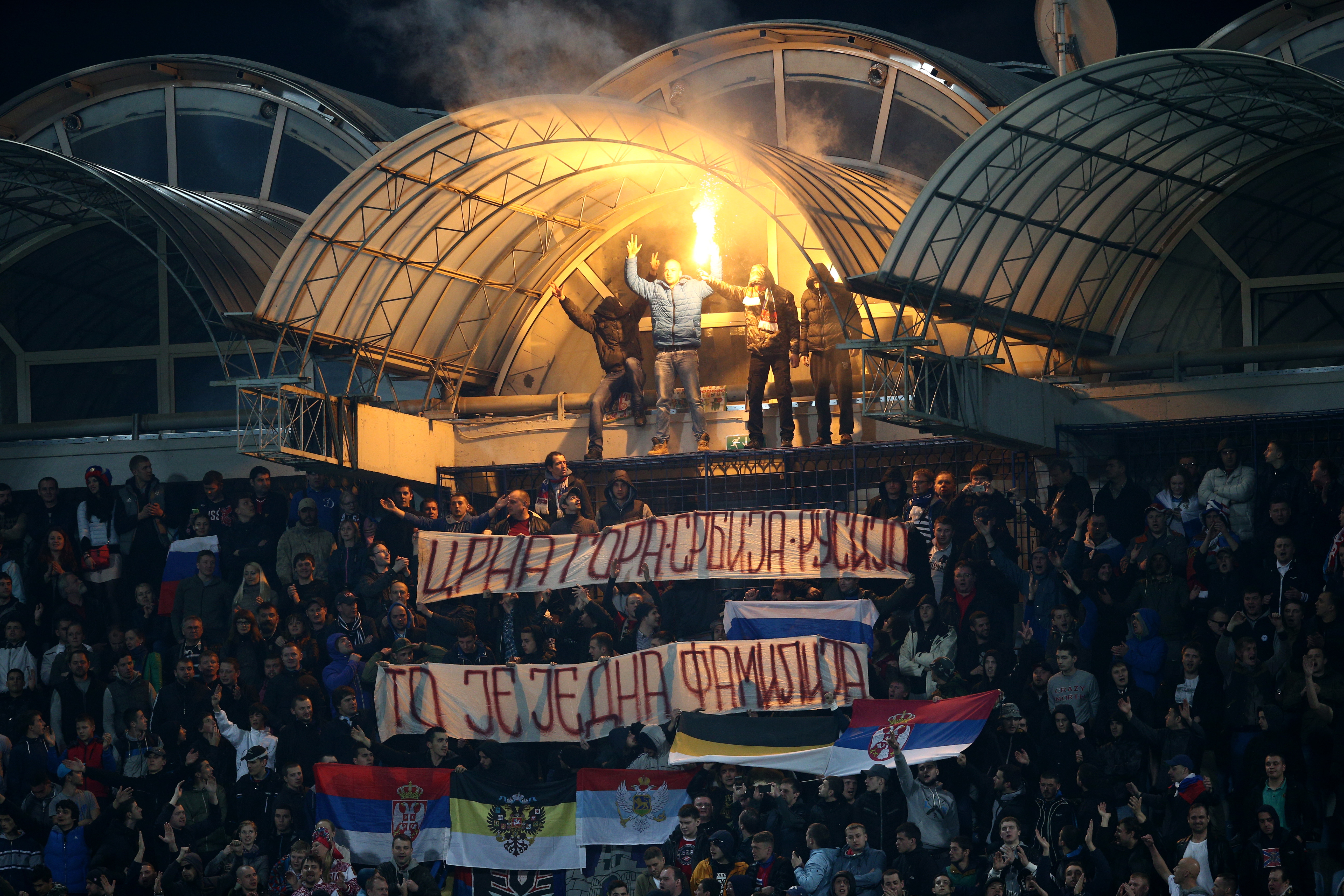 Кроме того, российским фанатам вменяется в вину демонстрация запрещенной символики – флагов Сербии, самопровозглашенной Донецкой народной республики и Российской империи. Это весьма существенное дополнение к файерам и прочим безобразиям на трибунах в Подгорице. Информация об этом появилась сразу после матча в черногорских СМИ, которые ссылались на запрет, наложенный УЕФА. Глава Всероссийского объединения болельщиков Александр Шпрыгин рассказал о том, что перед игрой было проведено совещание, на котором делегат матча предупредил, что "болельщикам категорически запрещено демонстрировать флаги ДНР, Сербии, "имперки". Все связанное с политикой строжайше запрещено". При этом, по словам представителя РФС, об этом совещании в его организации ничего не знают, что, конечно, выглядит очень странно.