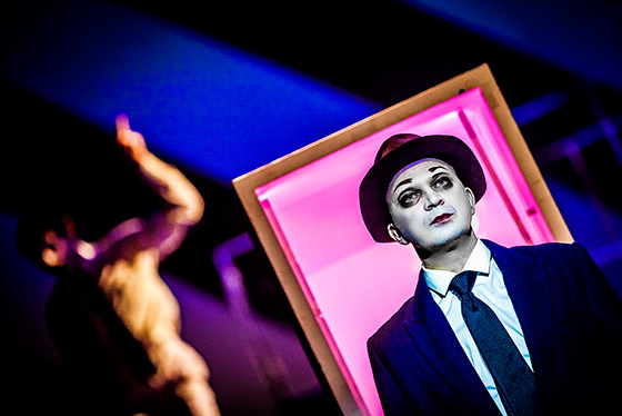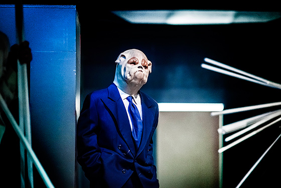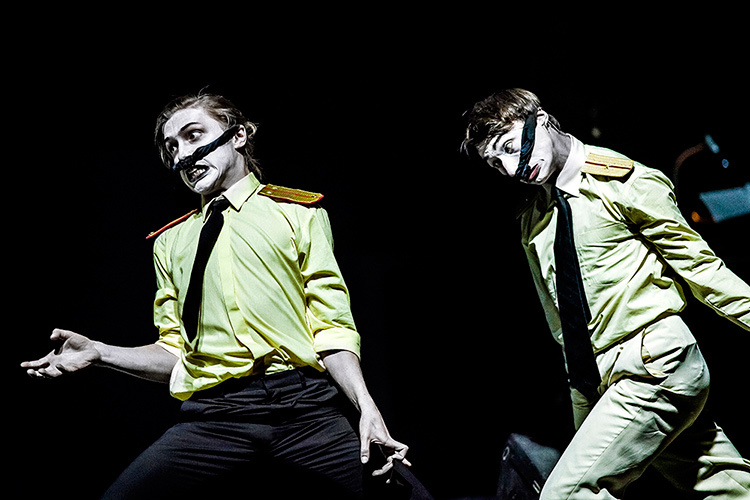 © Ира Полярная / Гоголь-центр Подобно тому, как Хармс расчленяет язык, отделяет слово от его привычного контекста («Стала профессорша тоже смотреть и видит, будто это уже не Толстой, а сарай»), — художник Семченко и режиссер Диденко меняют и дробят на части человеческие тела. Петр Павлович Пакин отрывает руку Андрею Семеновичу Ракукину. Профессор надевает на голову шар. Маска профессора уходит из рук его ассистента и начинает жить собственной жизнью. Большое красное пятно на черном костюме делает почти неразличимым силуэт того, кто этот костюм надел. Актер, выставленный в прорезанной в декорации «раме», как бы лишается ног, головы или туловища.