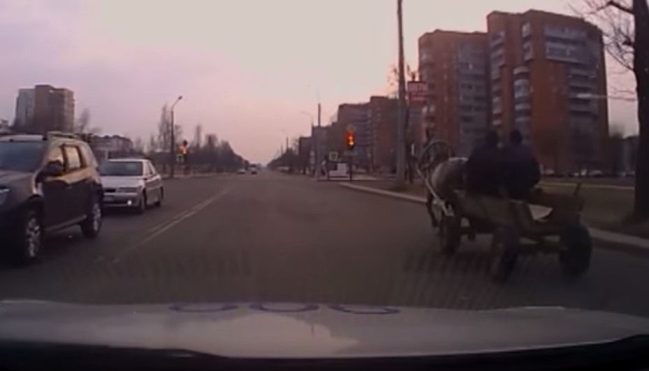 В белорусском Могилеве сотрудники ГАИ устроили погоню за конной повозкой из-за того, что возчик нарушил правила дорожного движения: он начал двигаться по тротуару чуть раньше, чем загорелся зеленый свет светофора.