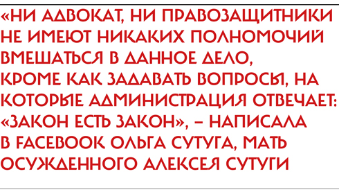 31 марта, вторник Антифашисту Алексею Сутуге дали еще 15 суток ШИЗО. В этот раз причиной стало нарушение формы одежды. Ранее Сутуге, известному как «Сократ», дали 7 суток в штрафном изоляторе за якобы найденную у него заточку. Сутуга осужден за хулиганство и побои на 3 года и 1 месяц лишения свободы. Сутуга своей вины не признает.