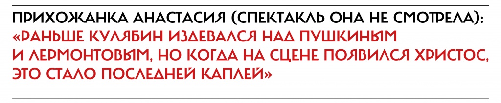 «Раньше он издевался над Пушкиным и Лермонтовым (в 2012 году Кулябин поставил в «Красном факеле» спектакль «Онегин», а в 2009-м — «Маскарад». — NT), но когда на сцене появился Христос, это стало последней каплей», — негодует прихожанка. С тех пор прокуратура успела возбудить против режиссера и директора театра административное дело и проиграть его в суде, а православные активисты — провести на площади Ленина «молитвенное стояние» с участием депутата Госдумы Николая Валуева.