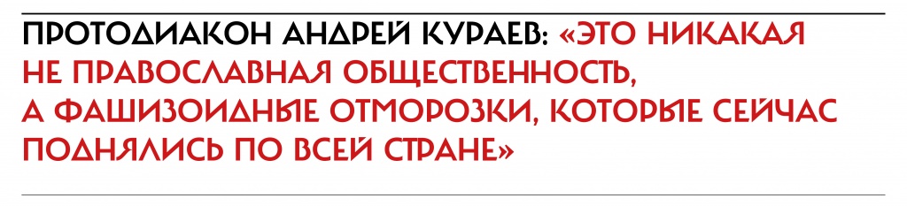 Протодиакон Андрей Кураев формулирует гораздо резче: «Это никакая не православная общественность, а фашизоидные отморозки, которые сейчас поднялись по всей стране, на фоне борьбы «за святую Новороссию». Они почувствовали, что на них есть спрос. И обратите внимание, ведь все эти митинги, шли под политическими флагами, георгиевскими лентами», — утверждает протодиакон. По его мнению, Патриархия умышленно не комментирует конфликт: «Очевидно, что ее все устраивает. Мол, смотрите, какие мы крутые, нас нужно бояться, мы на районе самые главные, так что с нами нужно дружить, а не то у вас будут проблемы», — заключает Кураев.