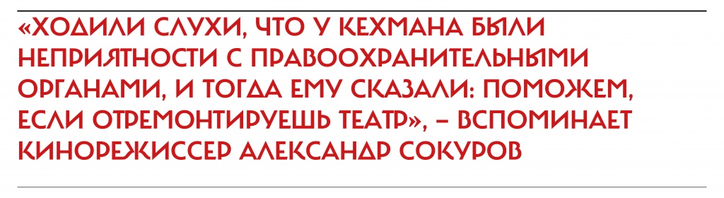 «Ходили слухи, что у Кехмана были неприятности с правоохранительными органами, и тогда ему сказали: поможем, если отремонтируешь театр, — вспоминает кинорежиссер Александр Сокуров. — Валентина Матвиенко, говорят, назначила его с условием, что он вложит свои средства в ремонт…»