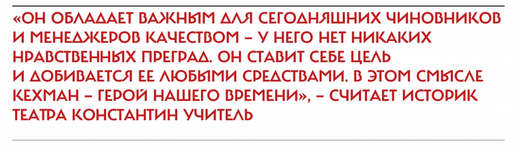 «Есть масса людей, которые учились формально, но кто-то стал при этом образованным человеком… Кехман — совершенно не склонен к системному образованию, — считает Учитель. — Может, это и не плохо для бизнеса. Но если говорить о системном образовании и культуре — трудно найти человека в этой среде менее образованного. Зато он обладает важным для сегодняшних чиновников и менеджеров качеством — у него нет никаких нравственных преград. Он ставит себе цель и добивается ее любыми средствами. В этом смысле Кехман — герой нашего времени, олицетворение эпохи. Но было бы куда полезнее использовать его таланты подальше от искусства».