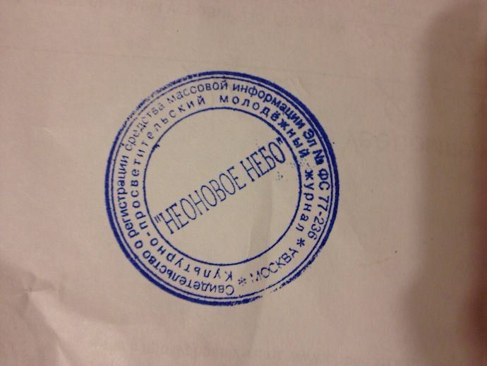 Этот же штамп Фимин использовал позже для подделки документов для кошки: чтобы отвезти ее в Крым, нужен был ветпаспорт с уколом, заверенным печатью. Времени делать все легально не было, поэтому «издатель» «Неонового Неба» проставил несколько латинских наименований и «подтвердил» их оттиском, который смазал пальцем (иначе было бы видно слова «культурно-просветительский журнал»).
