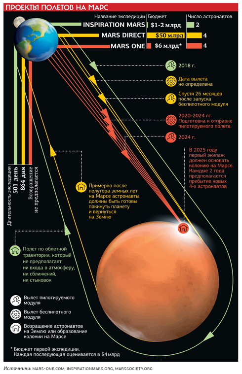 Ожидания порождают предложение — частные марсианские проекты: от развлекательных и образовательных, имитационных и научно-исследовательских до предельно серьезных. Но ни один из них не располагает и не может даже рассчитывать на бюджет, сопоставимый с бюджетом НАСА времен «Аполлонов», а на полет к Марсу потребуются гигантские расходы — более $400 млрд.