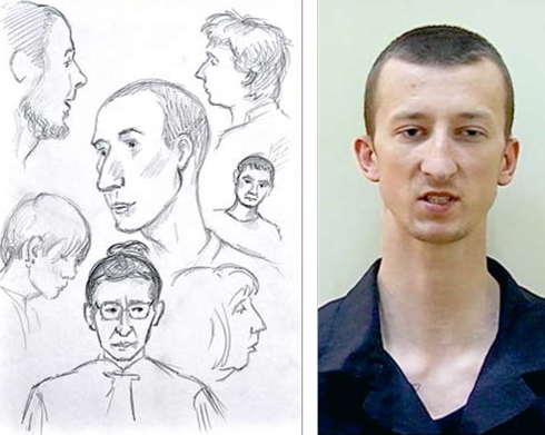 Рисунок Стаса Таничева из зала суда, Москва, 9 апреля 2015 года. Фото: nihilist.li, fsb.ru.