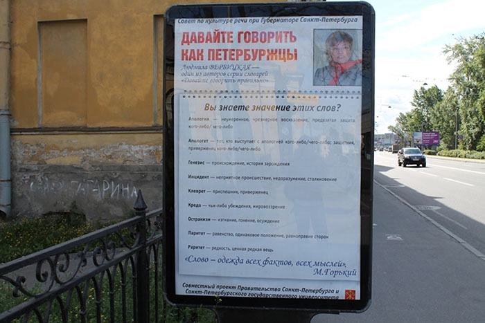 Нас давно волнует, что не существует официальной службы, которая следила бы за соблюдением норм современного русского литературного языка в рекламеМеня удивляет, что при соответствующих городских комитетах нет структуры, которая бы проверяла лингвистическое качество попадающих в публичное обращение текстов. На последнем заседании Совета по культуре речи при губернаторе Санкт-Петербурга было принято решение обратиться в ФАС, чтобы при их участии и содействии для начала разработать концепцию такой лингвистической службы и в дальнейшем ее создать. Насколько мне известно, реклама проходит проверку с художественной стороны, но лингвистические ошибки не менее важны. Поэтому мы хотим создать своего рода лингвистическую полицию. Понимаю, что это может звучать одиозно, но именно потому, что это вещь важная, я это так и формулирую. В метро висят плакаты проекта «Давайте говорить как петербуржцы», и многие жители города обращаются к Вербицкой со словами благодарности за эту просветительскую акцию. Еще меня радует интерес, который сейчас вызывает проект «Тотальный диктант». Потрясает, насколько быстро в Петербурге растет число желающих написать его. Диктант очень сложный, получивший за него «пятерку» должен продемонстрировать высший пилотаж. Но что меня поражает, так то, что написать его приходят буквально и стар, и млад. Когда я проверяю работу, в которой больше сотни ошибок, понимаю, что ее, скорее всего, написал мигрант. И меня восхищает, что он сам решил проверить уровень своей грамотности. Ведь это действительно общественная акция, приходить никто не заставляет. А какое количество людей потом интересуется, почему им поставили именно такую оценку, потому что просто хотят знать, в чем их проблема с письменной речью? «Респект и уважуха» новосибирским студентам, которые несколько лет назад все это придумали.