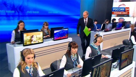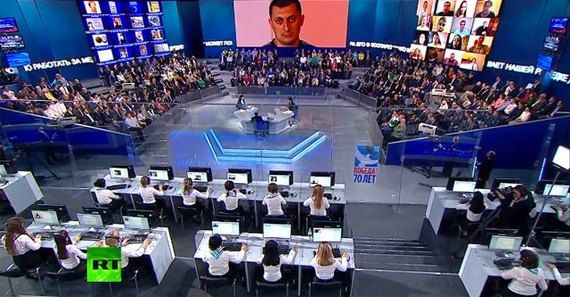 Почему-то первые минуты показывают не Путина, а операторов, которые говорят о том, что президенту наконец-то можно задать видеовопрос. XXI век!