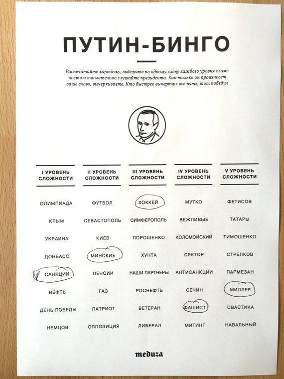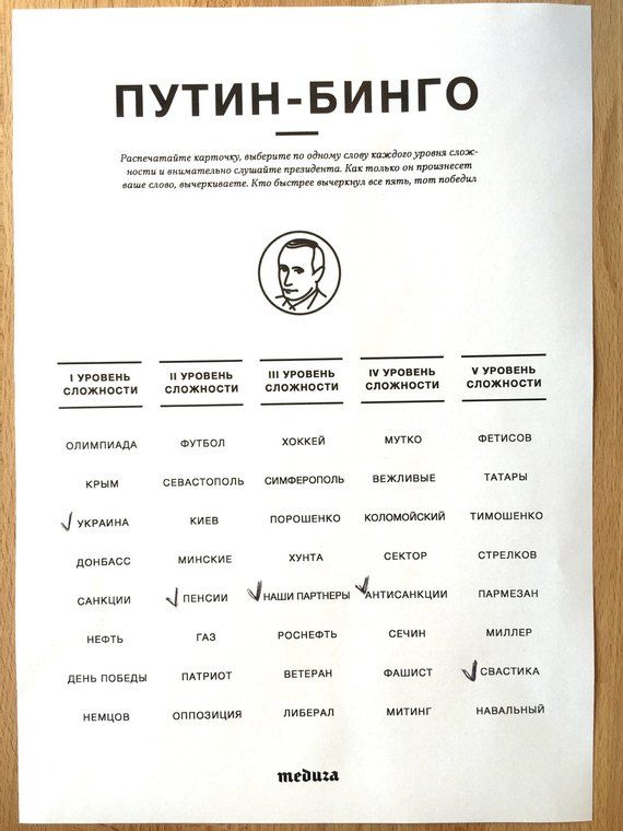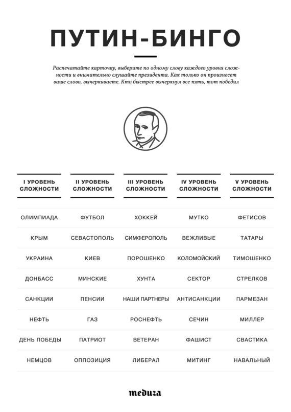 Так! У нас же Путин-бинго сегодня. Игра очень простая — распечатываешь себе бумажку, выбираешь по одному слову из каждого уровня сложности и слушаешь. Как только Путин произносит нужное слово, вычеркиваешь. Вычеркнул все пять — БИНГО!
