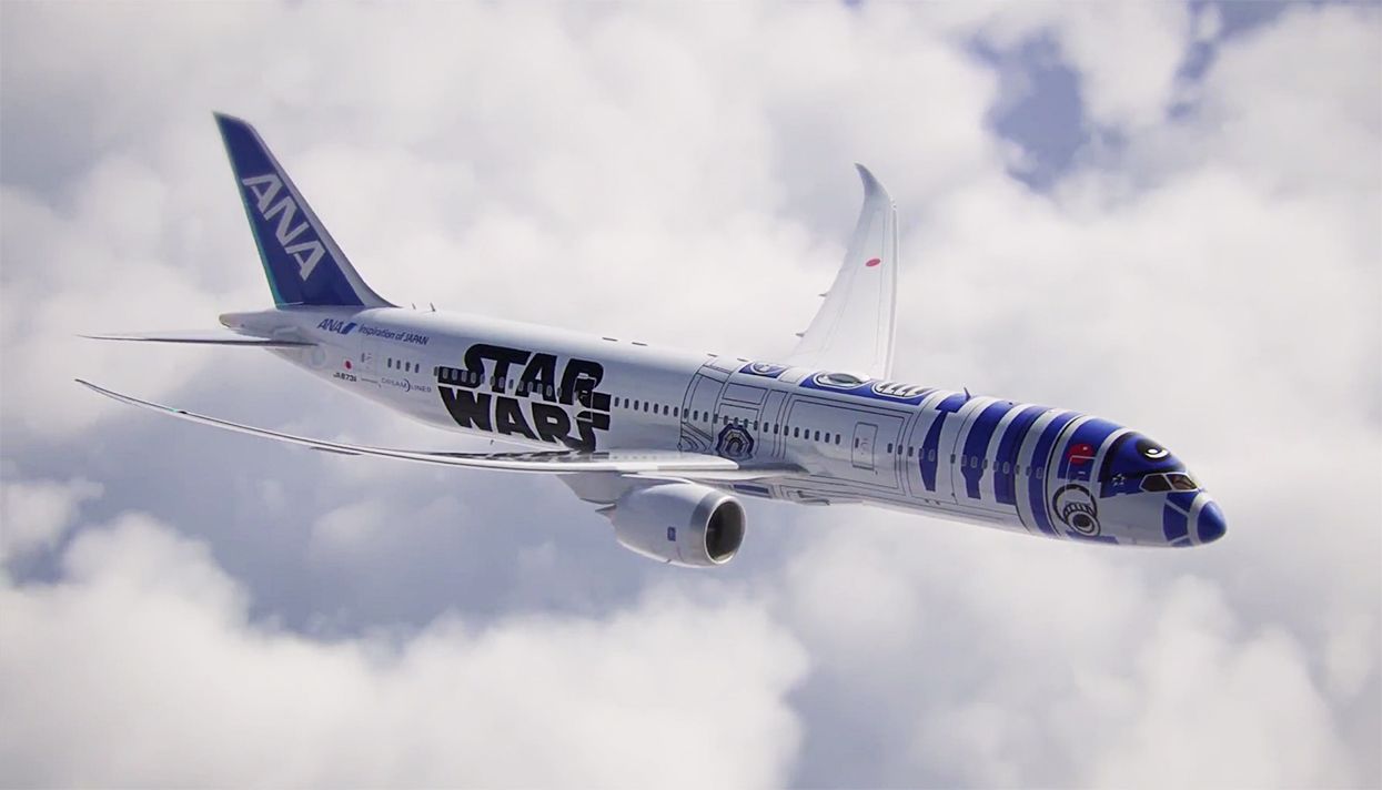 Японская авиакомпания ANA анонсировала самолет, посвященный роботу R2-D2 из «Звездных войн». Boeing 787-9 Dreamliner окрашен так же, как и знаменитый робот, а на фюзеляже написано «Star Wars».