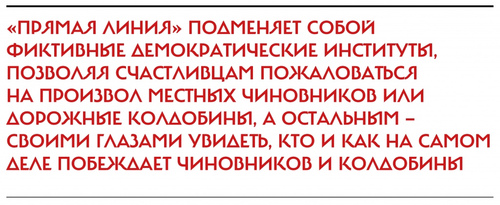 Граждане понимают: президент держит руку на пульсе, и если даже есть на местах отдельные недостатки — он в курсе, а значит, скоро мы недостатки преодолеем. Плюс «прямая линия» подменяет собой фиктивные демократические институты, позволяя счастливцам пожаловаться на произвол местных чиновников или дорожные колдобины, а остальным — своими глазами увидеть, кто и как на самом деле побеждает чиновников и колдобины.