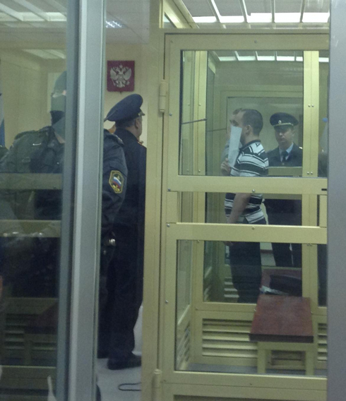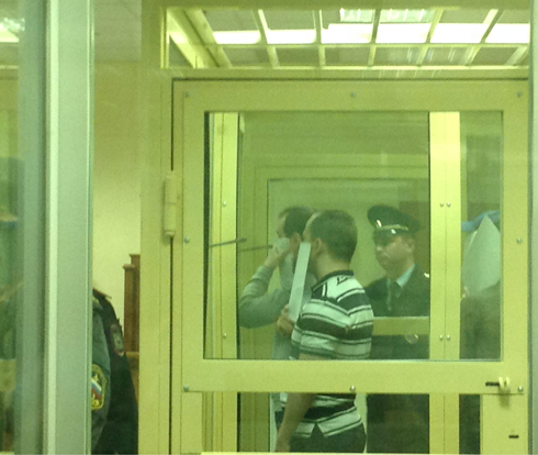 В «клетке» для подсудимых — Вячеслав Исаев (в полосатой кофте), Максим Баклагин (в глубине за Исаевым)