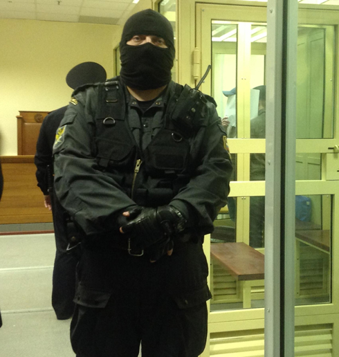 В зал впервые допустили фото- и видеокамеры, поэтому в помещении непривычно многолюдно. Толпа из журналистов федеральных телеканалов — всего около 30 человек — окружила адвокатов обвиняемых и постоянно приходящих на заседания родственников Чувашова. Между журналистами и «аквариумом», в котором сидят националисты, встали одетые в черное коренастые сотрудники с шевронами «спецназ». Сегодня, в отличие от прошлых заседаний, их лица закрыты балаклавами.
