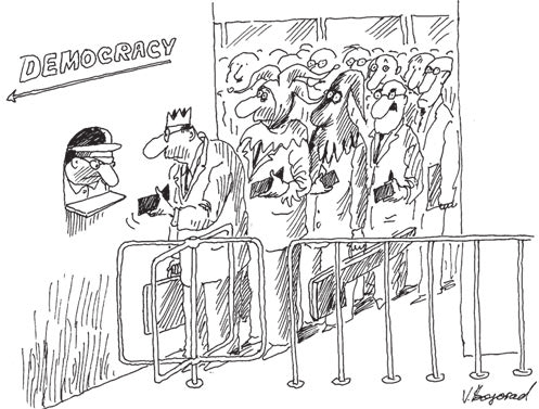 У нас механизм стал хитрее: кандидатов на выборах много, но конкурентов отсеивают на дальних подступах (придумок для этого уйма), общаться с массами избирателей их не допускают — все средства у того, кто уже обладает властью и титулом, и подсчет итогов ведут его помощники. Так что все знают заранее, каков будет итог. А так всё как у людей: президент, премьер, вице-премьеры, министры, парламент (только женского рода — Дума), суды… Но они не функционируют, а делают вид.