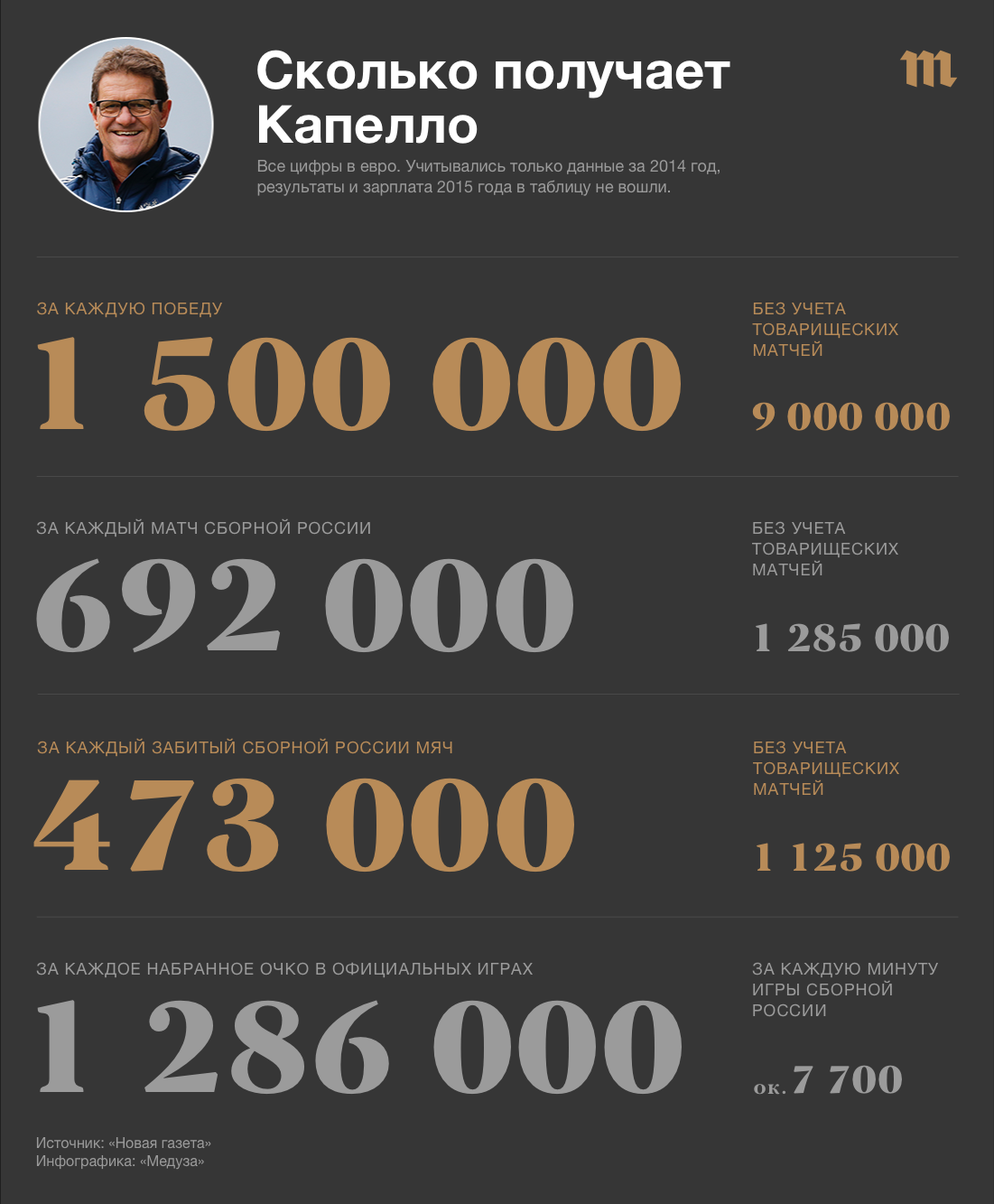 «Новая газета» опубликовала контракт главного тренера сборной России по футболу Фабио Капелло. Из него следует, что итальянец получил за 2014 год около девяти миллионов евро — семь в качестве основной зарплаты и еще два в качестве бонуса за выход на чемпионат мира в Бразилии. «Медуза» показывает, как много зарабатывает Капелло — особенно если учесть, что сборная России в последнее время совсем перестала выигрывать.
