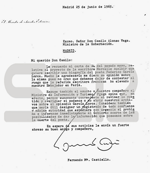 Среди опубликованных в апреле 2015 года документов есть и письма министров. Так, например, Кастьелья написал записку министру внутренних дел, в которой передал мнение Мануэля Фраги о необходимости «назначить чиновника, надежного и наделенного всеми полномочиями» для прояснения обстоятельств смерти поэта и доклада о них правительству, а также с просьбой «уточнить, можем ли мы или нет открыть архивы по делу Гарсиа Лорки». В ответном письме Алонсо Вега высказал сомнения в необходимости раскапывать «дело Лорки» и предложил ответить, что у них «нет возможности дать официальную версию того, как произошло это событие». Отчет в итоге был сделан, но так и не передан писательнице.
