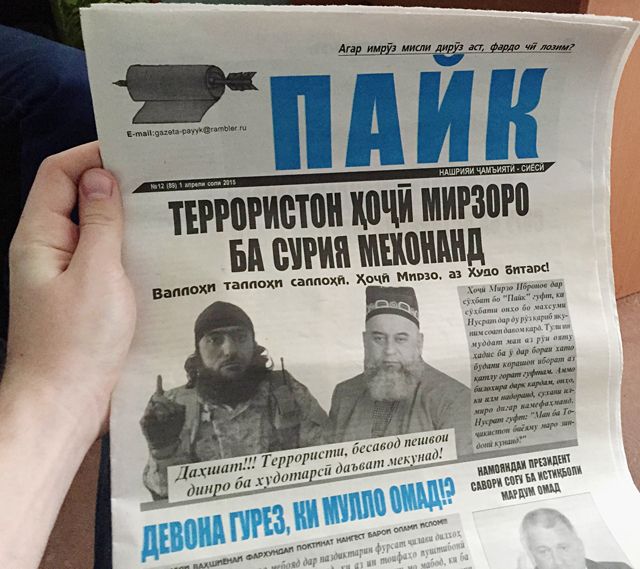 At the beginning of 2015 during a phonecall, Nusrat threatened the editor-in-chief of Paik for publishing photos of Tajik fighters. “He said to me, ‘We’re scary. We cut people’s heads off. We’ll set you all on fire, we’ve got people here,’” Ahmad Ibrohim tells me. In his hand he holds a mobile phone decorated with the Tajikistan flag. Behind him hangs a portrait of President Emomali Rahmon.