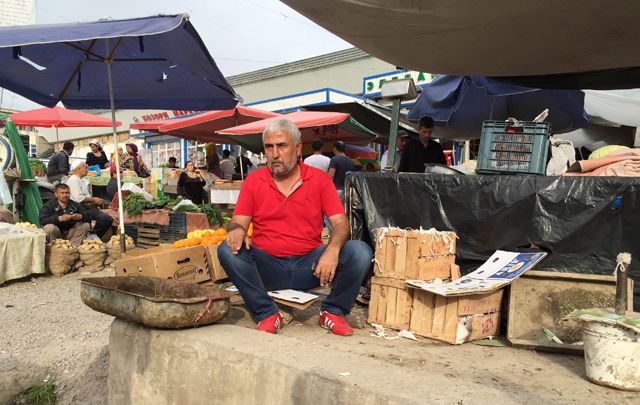 Some say that in it’s easy to find Nusrat Nazarov’s older brother Hairullo around Kulyab’s Bazaar. But local journalists advise not to bother, since he seems to have disappeared from the city. I ask around further, in hopes of finding him. Some people just shake their heads, but others tell me to “look for a man in red near a red car.” I work my way through the market and find a red car. There’s no one in it. A voice from behind me asks, “Taxi?” I turn around. There’s a man squatting and chewing chukri, a crunchy mountain grass, which tastes a bit like sorrel. He’s wearing a red T-shirt and red sneakers.