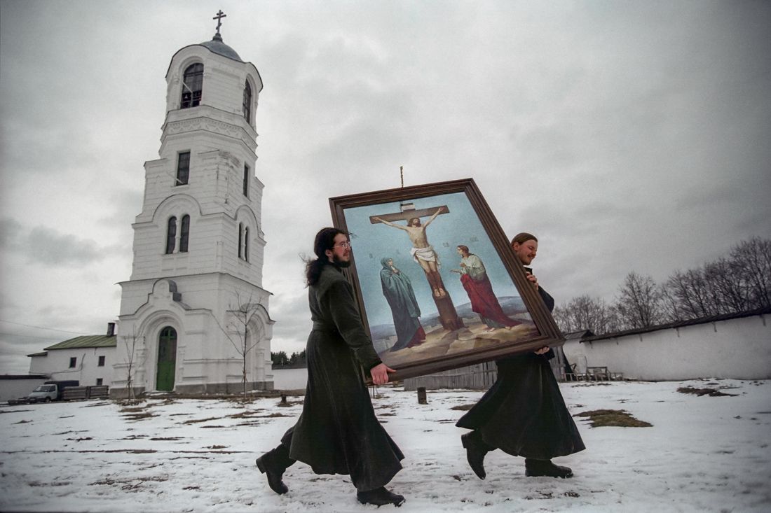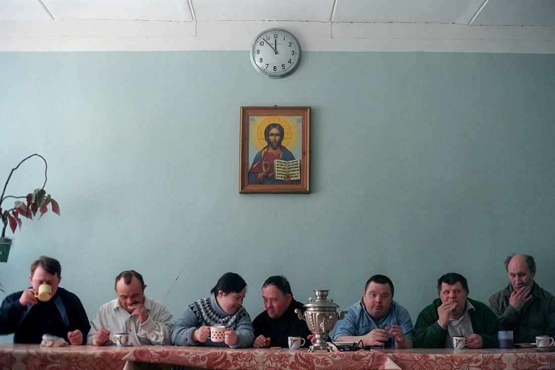 Золотые зубы. Мой приятель Сергей Тягин, увидев эту фотографию сказал: улыбка Саурона. Ничего демонического в парне нет — зовут Саша, работал водителем в комитете по культуре мэрии Тобольска. Сашу и его уазик-буханку мэрия отправила мне на подмогу, когда мы делали материал о Тобольске для GEO. Картинку я снял, когда мы с журналистом Александром Можаевым вечером переправлялись на пароме через Иртыш. Мы вышли погулять по парому, а Саша остался в кабине, и сложно было не заметить этот треугольник — зубы, церковь и крест. Паром двигался быстро — и церковь стремительно исчезала. А пленки в камере не было. Вообще говоря, ее почти совсем не было, израсходовал весь взятый на день запас. Оставалась лишь (чудом вспомнил!) много месяцев болтавшаяся в кофре катушка восьмисотки — по тем временам штука экзотическая. Пока заряжал пленку, церковь совсем съехала к левому краю окна, едва успел сделать несколько кадров. И как всегда бывает — при любом количестве дублей точная карточка всегда одна. Помимо ослепительной улыбки запомнилась Сашина присказка: «Мясо без водки только собаки едят!» А один неплохой фотограф написал на моей страничке: «Фотография на обложке [имеется в виду обложка моей книги „Последняя Империя: 20 лет спустя“] удивительно дебильно-постановочно-пропагандистско-совковская по стилистике. Никакого отношения к репортажной фотографии она не имеет».
