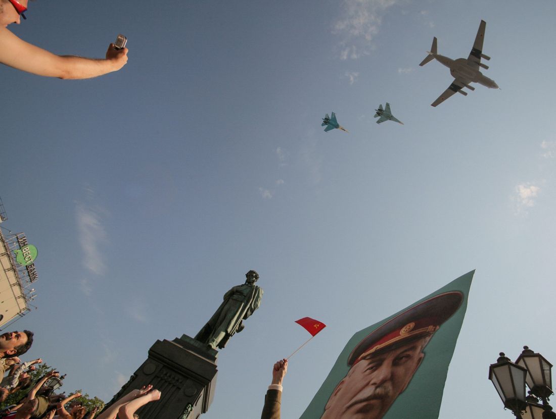 Первомайскую демонстрацию снимал в Москве. Там же снимал в обществе «Мемориал». Слетал в Пермь, поснимал зону «Пермь-36» — тогда там был музей ГУЛАГа. В Питере ходил с коммунистами расклеивать листовки со Сталиным. Снимал в троллейбусе, на который те же коммунисты на правах рекламы нанесли портреты вождя. Вроде, более чем достаточно для одного материала, но у меня было чувство, что главной картинки нет. Решил еще съездить в Москву на парад Победы. Иду по Тверской в направлении Кремля, понимаю, что без аккредитации меня на парад не пустят. Вдруг на Пушкинской площади замечаю старуху с портретом Сталина. Она стоит лицом к проезжей части, демонстрируя портрет проезжающим по Тверской боевым машинам. А мне — ну никак не подлезть, чтобы и Сталин и танки! Ужом вертелся — никак! А танки-то и прошли, народ расходиться стал, обидно — смерть! И старуха моя засобиралась, но я от нее не отстаю. И тут полетели! Плюхнулся на спину, лежу на Тверской поперек тротуара в плевках и жвачках и понимаю — вот она, картинка! В номер эта фотография так и не встала. Говорят, всем понравилась, но материал был уже сверстан, а переделывать не стали.