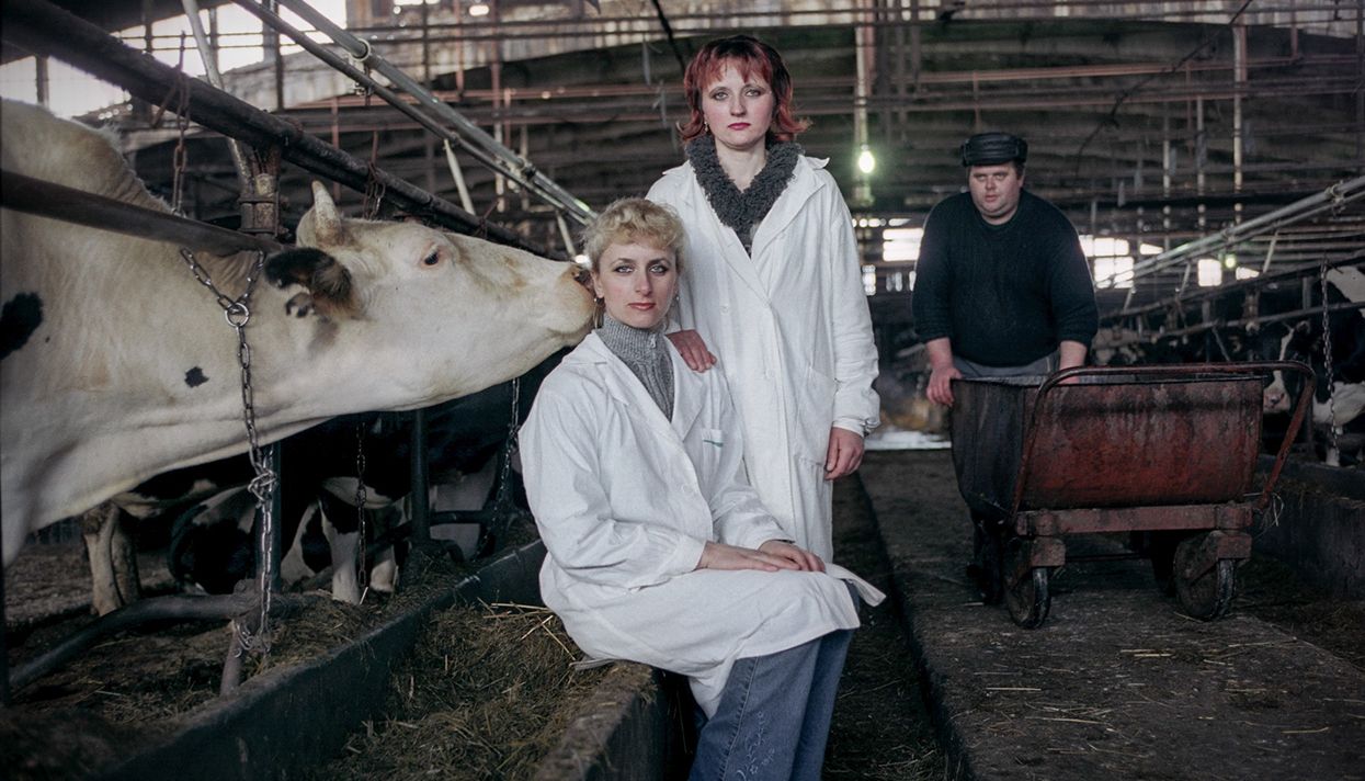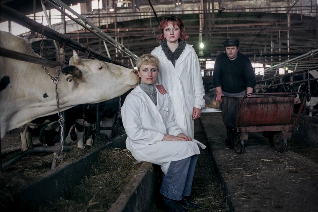 Самым трудным было найти гламурных доярок. Я позвонил замечательному фотографу Жене Асташенкову. Женька уже лет 30 работает в газете «Тосненский вестник» и знает в своем Тосненском районе не только всех доярок, но, я уверен, и всех коров. «Есть!» — сказал Женька — «Есть гламурные доярки! Тебе понравятся!» Девчонки уже ждали нас в боевой раскраске. Выяснилось, что одна из сестер пошла на повышение и теперь работает техником-осеменатором. По мне — так еще интереснее. Пока ходили по коровнику, заметил, что одна корова все время тянется к людям, требуя внимания. Поставил девушек рядом с ласковой коровкой, велел быть серьезными и смотреть в объектив. Корова, как я и надеялся, полезла целоваться. А тут и мужчинку c тележкой Бог послал, за что ему большое спасибо!