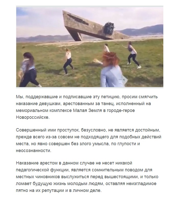 11 апреля члены танцевального кружка сняли видеоролик с танцем на фоне мемориала "Малая земля". Позже полиция Южного района города составила протоколы об административном правонарушении. 25 апреля Октябрьский районный суд Новороссийска вынес постановления: аресты, штрафы, административное дело в отношении родителей несовершеннолетней участницы кружка о "неисполнении обязанностей по воспитанию несовершеннолетних".