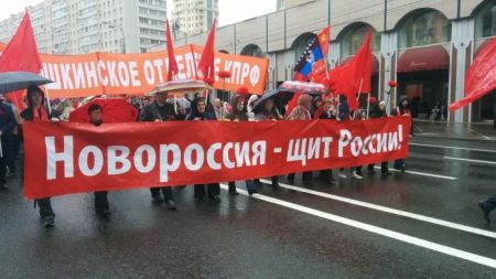 Участники шествия несли плакаты в поддержку самопровозглашенных ЛНР и ДНР. Один из лозунгов гласил: "Новороссия - щит России". Традиционно много было красных флагов и портретов Владимира Ленина и Иосифа Сталина.