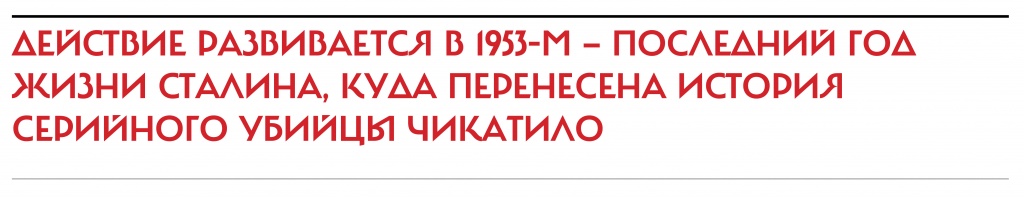 Кроме того, в фильме почти не изображаются события «до» и «во время войны». Так — мимолетно. Никакого оскорбления 70-летия Победы нет. Действие развивается в 1953-м — последний год жизни Сталина, куда перенесена история серийного убийцы Чикатило. Одна из главных тем — интриги внутри Министерства госбезопасности (МГБ), которое скоро переименуют в КГБ.
