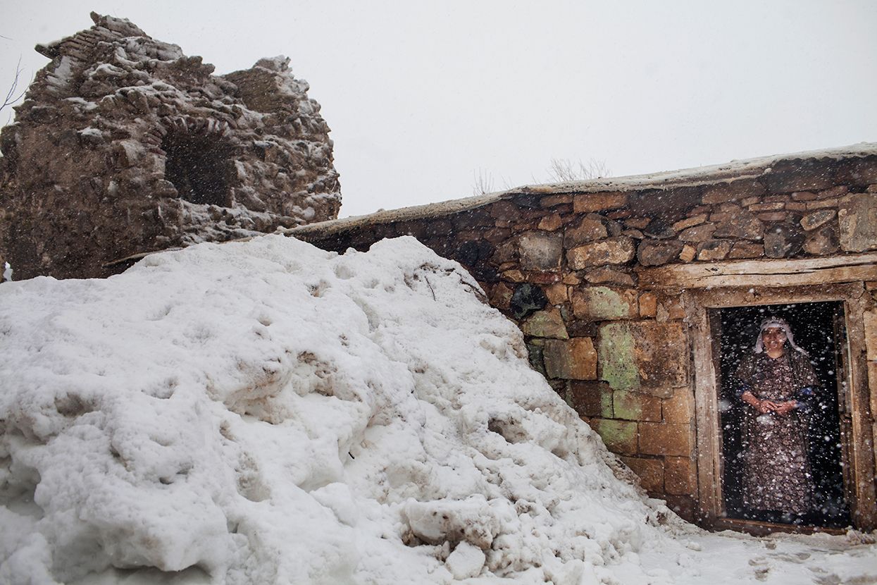 Женщина-мусульманка стоит в дверях своего дома, который построен из камней разрушенного в 1915 году монастыря Сурб Карапет