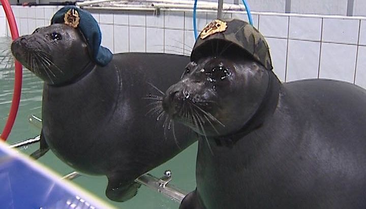 В иркутском нерпинарии подготовили «военно-патриотическую программу»: нерп Ласку и Винни-Пуха научили носить береты на головах и держать автоматы и флаги в ластах. Кроме того, животные открывают пасти, симулируя воинское приветствие, и машут ластами, словно генсеки, принимающие парад Победы.