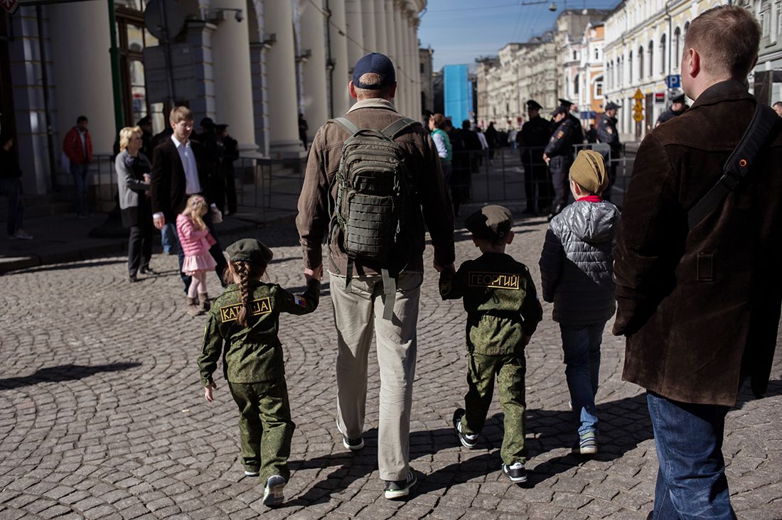 Мужчина ведет своих детей на генеральную репетицию парада в честь 9 мая