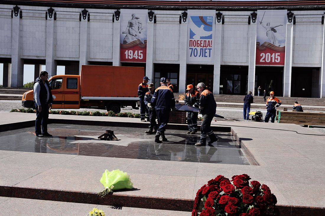 Сотрудники коммунального предприятия устанавливают металлическую звезду на место Вечного Огня на Поклонной горе