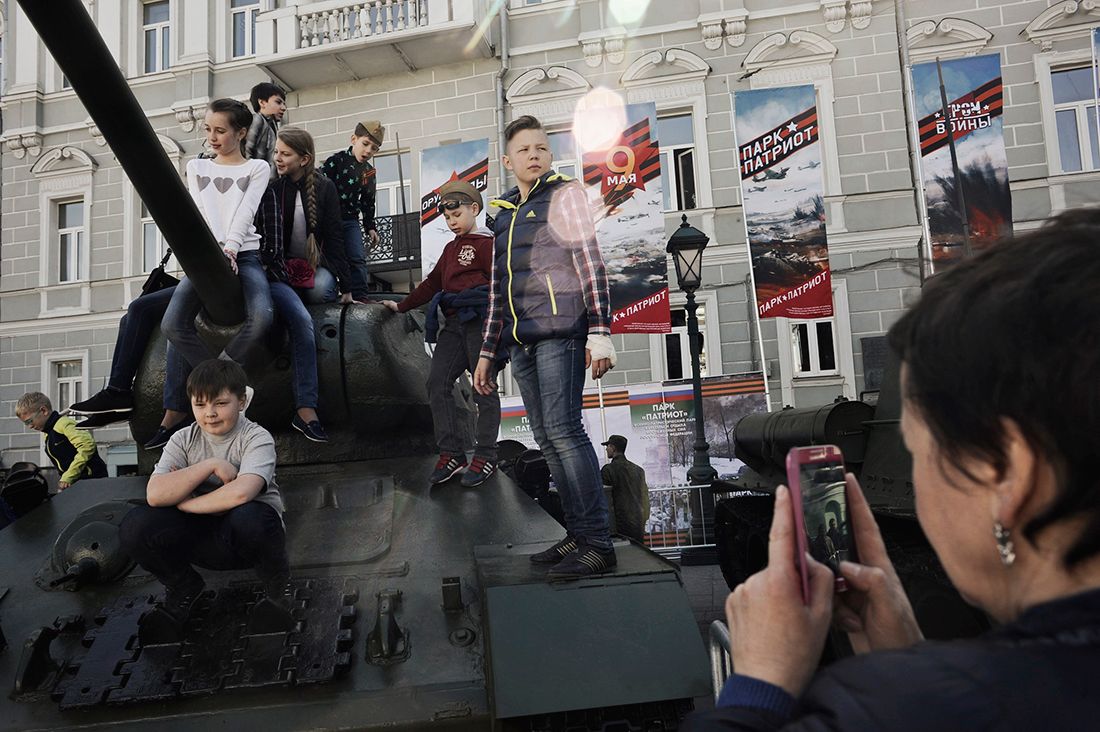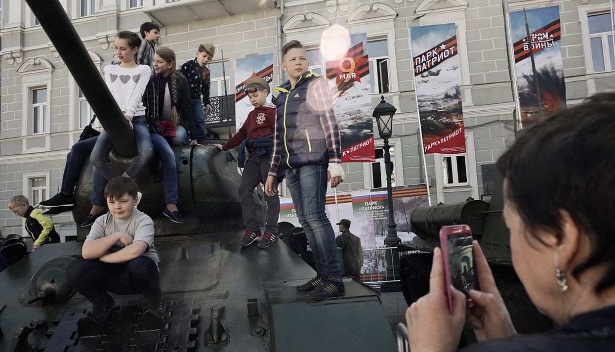 Дети фотографируются на танке около станции метро «Библиотека им. Ленина» после генеральной репетиции парада