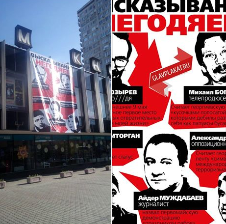 На плакате — цитаты журналистов Айдера Муждабаева, Александра Рыклина, Михаила Козырева, телепродюссера Михаила Богомолова и актера Максима Виторгана.