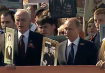 В акции принял участие и Владимир Путин. Главу государства, несущего фотографию своего отца, показал в прямом эфире "Первый канал". "Ценность этой инициативы в том, что она родилась не в кабинетах, не в административных структурах, а в сердцах наших людей", - сказал президент.